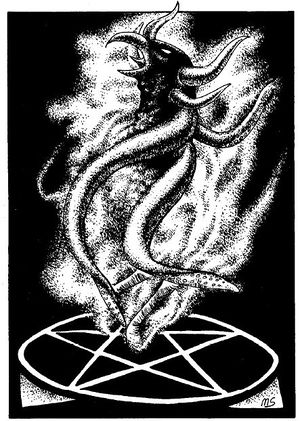 In dem leeren Raum darunter entdeckten wir ein weiteres Pentagram und Kindreck konnte erkennen, dass aus diesem ein Shruuf hervorkommen wird. Kindrecks rudimentäre Kenntnisse über diese Art von Dämon lassen uns zweifeln, ob wir diesen Kampf gewinnen können. Die Kreatur scheint zu mächtig zu sein, um sie in einem Kampf zu besiegen. Wir überlegen eine ganze Weile, was wir tun sollen. Schmerzlich ist uns bewusst, dass die Zeit gegen uns spielt. Bisher sind wir zu keinem vernünftigen Ergebnis gekommen.